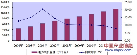 2004-2012年中國發電總裝機容量連續快速增長,“十一五”期間年均新增裝機容量近8,500萬千瓦,遠高于“十五”期間約4,600萬千瓦的年均新增容量。2012年發電總裝機容量達到11.45億千瓦,2015年,國內發電機裝機容量將達到14.37億千瓦左右,將超過美國而躍居世界第一。