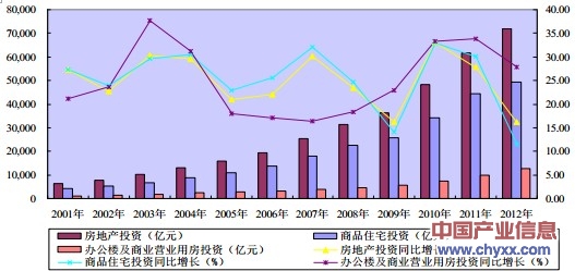 2001-2012年房地產投資、商品住宅投資、辦公樓及商業營業用房投資和變化趨勢