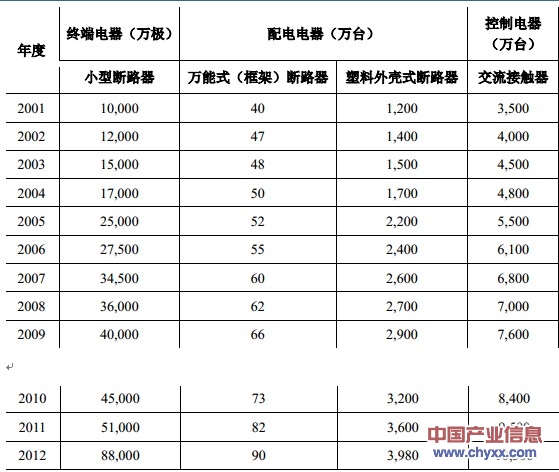 根據中國電器工業協會的統計,2001 年至 2012 年主要低壓電器產品的產銷量呈逐年上升趨勢,低壓電器產品保持較快速度增長,終端電器、配電電器、控制電器產量復合增長率分別為 21.86%、11.41%、10.50%,今后較長一段時間內我國低壓電器市場容量仍會穩步增長。
