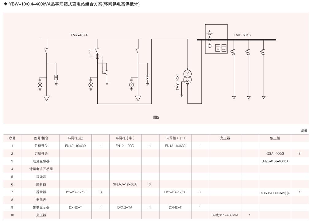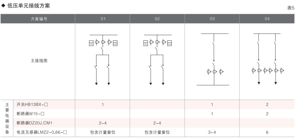 本變電箱高、低壓單元均采用組合式柜.按所需要接線組合成高、低壓配電系統常用高、低壓柜的接線方案均可選用,同時高壓單元又可組合成環網型式等。(見表4、表5)