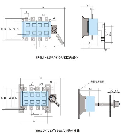 | A | B | C | D | D1 | E | G | J | J1 | J2 | K | P | R | S | T | U | ΦX | Y | L | F |