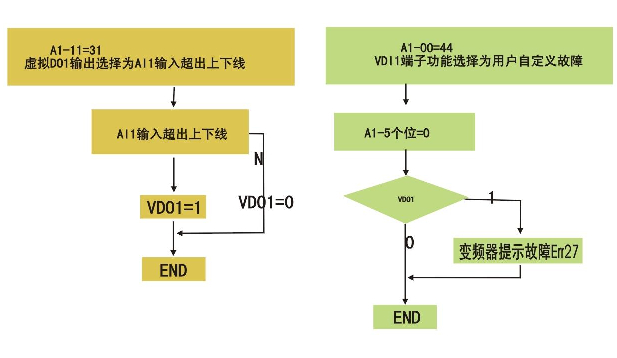 選用輸入輸出擴展卡,模擬量輸入A13可接受電機溫度傳感器輸入(PTlOO,PTlOOO)。當電機溫度越過預警值時,變頻器輸出脈沖信號提示過熱,當電機溫度超過過熱保護值時,變頻器故障輸出給電機妥善的保護。