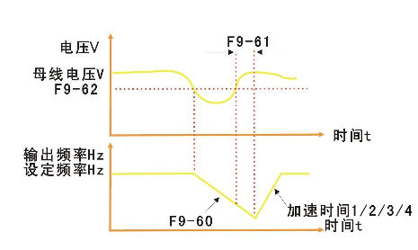 此功能指在瞬時停電時變頻器不會停機,在瞬間停電或電壓突然降低的情況下,變頻器降低輸出速度,通過負載回饋能量,補償電壓的降低,以維持變頻器短時間內繼續運行。