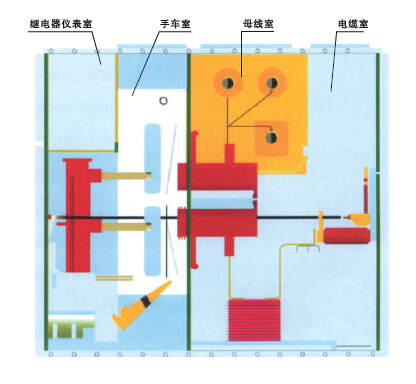 開關柜的外殼和隔板是用敷鋁鋅板經數控機床加工和折彎之后連接而成。因此裝配好的開關柜能保證結構尺寸的統一性。開關柜被分隔為斷路器室、主母線室、電纜室和繼電器儀表室,各部分以接地的金屬板分隔。