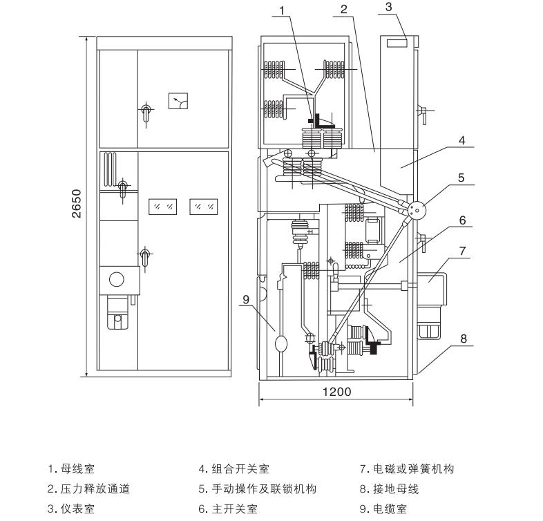本開關柜為金屬封閉箱型結構,柜體骨架由角鋼焊接而成.柜內用鋼板分隔成斷路器室,母線室,電纜室,繼電器室,并可通過門面上的觀察窗和照明燈觀察柜內各主要元件的運行情況。為提高開關柜的技術性能,各主要元件進行了重新設計(如斷路器,旋轉式隔離開關等),根據柜體布置,繼電器室可安裝繼電器,門上可裝設信號繼電器、指示儀表、信號燈,轉換開關安裝于操作小室。后面為母線室,下面為電纜室,用戶可方便地進行接線,前面為斷路器室,方便了開關柜主開關的檢修,柜體內部機構參見圖1、圖2和產品說明書。