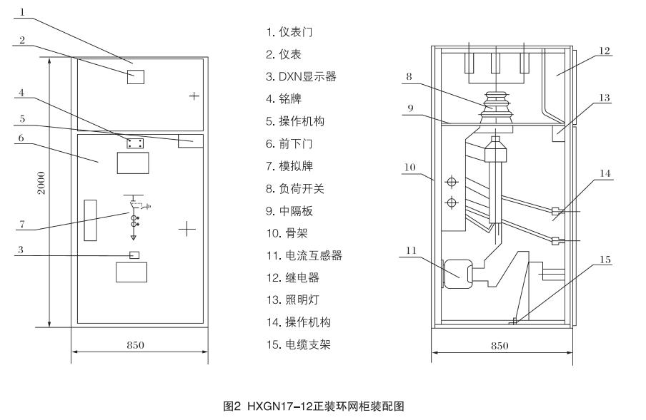 電器元件主要有帶側面機構的FN12-12負荷開關VEI公司ISARC型負荷開關LKE公司LBS型或VLBS型負荷開關(9),電流互感器(12),電壓互感器,高壓帶電顯示器(3)等組成,并且全部固定在柜體上。